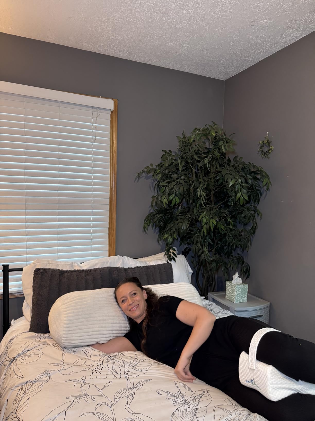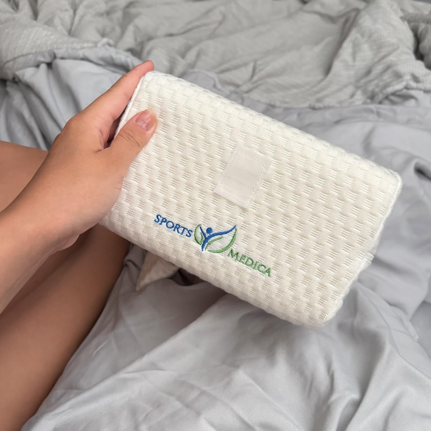 "I use it between my knees at night, but I also put it under my neck for cervical support and under my feet for elevation. One pillow does it all. The quality is obvious from day one—the memory foam, the cover, the strap. Highly recommend."